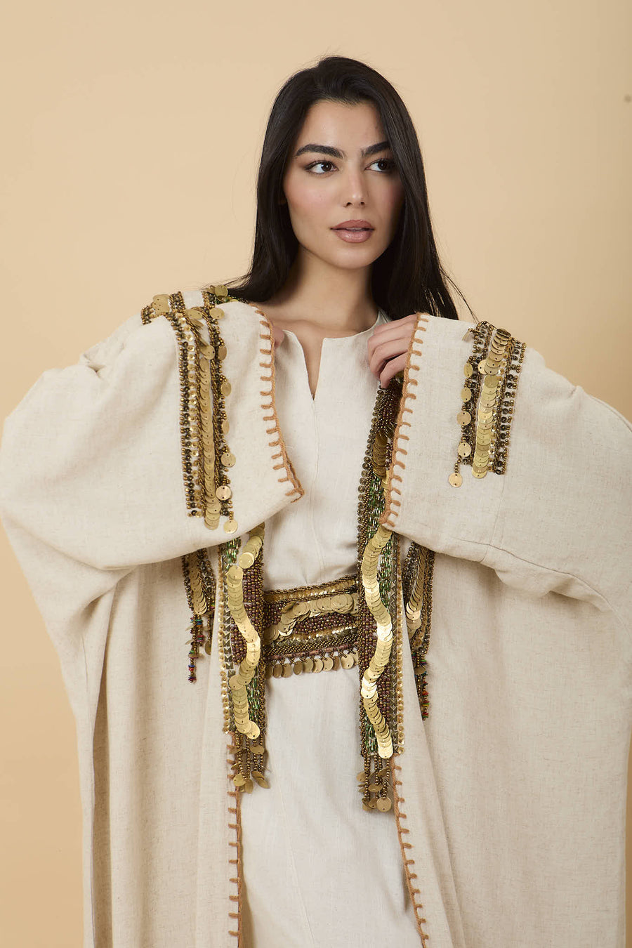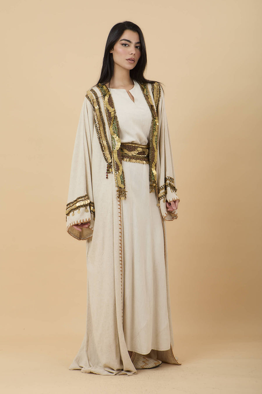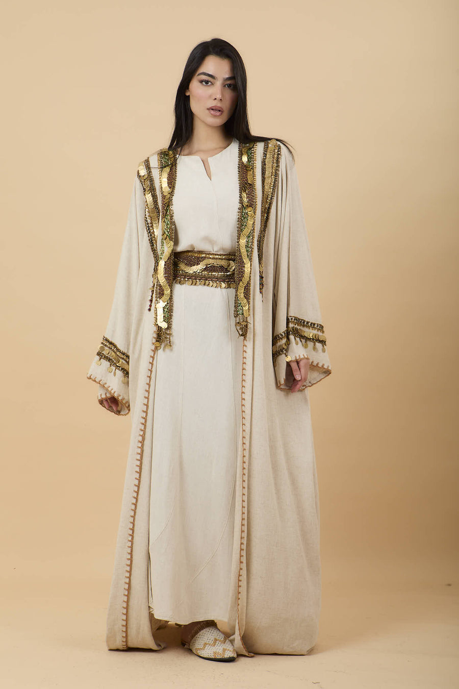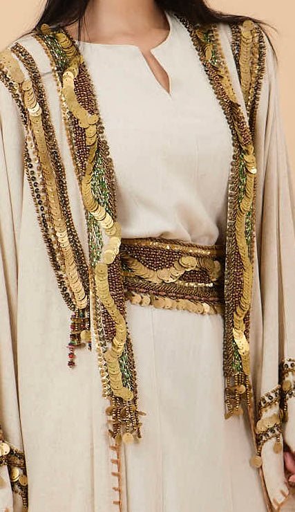 Beige Handmade oriental embelishments gold & green